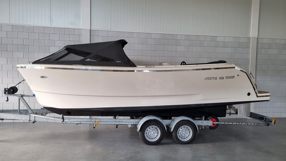 Skøn Hollandsk kvalitets Tender med en kraftig 42HK Craftsman diesel motor, meget moderne linier præger denne exclusive Hollænder, højt fribord gør den sikker at opholde sig i, er derfor også meget velegnet til at sejle på havet, så en tur til Hven eller Samsø afhængig af hvor du sejler fra klarer den også som en leg, du kan også tage en enkelt overnatning eller 2 hvis du falder i godt selskab, bemærk at dette er ikke en fra pris, men for en komplet båd så du ved hvad du kan regne med, fuld kaleche, køleskab, HPL teakpakke, lanterner, de luxe Diamant hynder, solsengs modul, badestige, lanterner, EL panel, lænse pumpe etc. da den er med fast skrueaksel og klassisk ror styring har den ekstremt retningsstabile styreegenskaber, også ved lav fart, en hurtig luxus Tender som ikke kræver speedbåds kørekort, båden er 2,43m bred og vejer 1100kg til en samlet pakkepris,,,